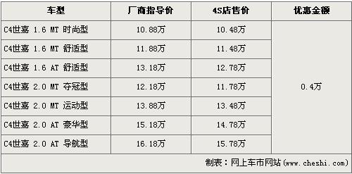 C4世嘉是東風(fēng)雪鐵龍于2008年7月28日發(fā)布的去年第二款新車,廠商指導(dǎo)價為10.88萬-16.88萬元。今年的4月6日,東風(fēng)雪鐵龍又為C4世嘉添加了2.0L手動奪冠版車型,致使C4世嘉車型增加到了7款。近日根據(jù)網(wǎng)上車市價格監(jiān)測系統(tǒng)顯示,C4世嘉目前全系優(yōu)惠4000元,具體車型售價見下表: