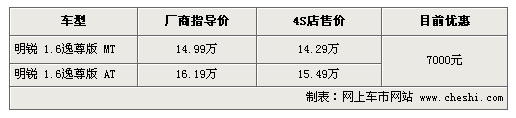 雖然明銳1.6逸尊版僅上市1天,但經(jīng)銷商已經(jīng)放出7000元的現(xiàn)金優(yōu)惠,如果希望店內(nèi)送裝飾,可優(yōu)惠現(xiàn)金6000元。但目前現(xiàn)車較緊張,需要訂車,訂車最快也需要20天左右,如果訂購車輛顏色較少,需等一個(gè)半月時(shí)間,定金為5000元。