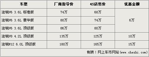 途銳是大眾首款引進(jìn)我國的SUV車型,在3.6L及4.2L率先上市后,大眾為了滿足消費(fèi)者的更大胃口,緊接著又推出了搭載12缸發(fā)動機(jī)的6.0L車型。隨著大排量消費(fèi)稅的頒布,給9月份后入關(guān)的大排量車型帶來了一次不小的沖擊,令大排量汽車價格都上調(diào)了不少,大眾途銳6.0L頂級版也從原來158萬元的價格上調(diào)至了180元。近日據(jù)網(wǎng)上車市價格數(shù)據(jù)監(jiān)測顯示,大眾途銳全系的最高優(yōu)惠達(dá)到了15萬元,具體詳情請看下表: