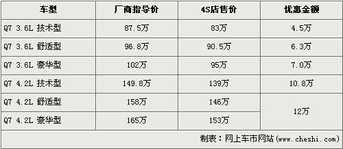 據(jù)銷售人員介紹,奧迪Q7分為3.6L和4.2L兩種排量共7款車型,目前全系最高優(yōu)惠為12萬元。3.6L車型最高優(yōu)惠7萬元,其中最低配的技術(shù)型優(yōu)惠后售價(jià)降到了83萬元,3.6L舒適型售價(jià)降到了90.5萬元,3.6L豪華型售價(jià)95萬。排量更大的4.2L車型優(yōu)惠最高更是達(dá)到了12萬元,4.2L舒適型售價(jià)降到146萬元,4.2L豪華型售價(jià)降到了153萬。