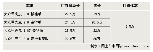 據(jù)4S店銷售人員介紹:目前甲殼蟲全系可優(yōu)惠3.5萬元,2.0標(biāo)準(zhǔn)版售價(jià)僅為19萬,但目前硬頂版甲殼蟲無現(xiàn)車,訂車需等半個(gè)月至兩個(gè)月。敞篷版目前現(xiàn)車較充足,喜歡的朋友可以不必等待漫長的訂車時(shí)間。