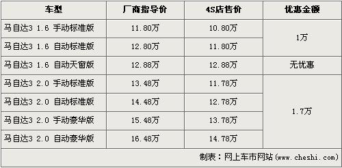 長(zhǎng)安馬自達(dá)旗下主力車型-馬自達(dá)3以1.6L車型于06年開(kāi)場(chǎng),隨后又為車系注入了2.0L車型,2年時(shí)間馬3憑借動(dòng)感的外觀以及優(yōu)越的性能博得了消費(fèi)者的喜愛(ài)。今年的4月2日長(zhǎng)安馬自達(dá)又為消費(fèi)者帶來(lái)了1.6L的自動(dòng)天窗版車型,豐富了馬3的銷售車型。據(jù)了解,近期購(gòu)買馬自達(dá)3的消費(fèi)者可以得到最高1.7萬(wàn)元的優(yōu)惠,具體詳情請(qǐng)看下表: