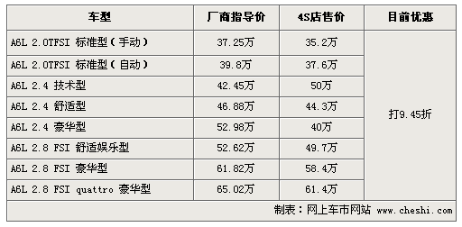 據(jù)4S店銷售人員介紹:目前奧迪A6L車系全部打9.45折,售價(jià)在35.2萬至61.4萬之間。但2.0TFSI基本型與3.0TFSI豪華型無車,也不接受預(yù)訂。車身顏色方面,黑色是A6L的主打色,同樣顏色也較齊全,除了上兩款車型無車外,其它車型現(xiàn)車充足。