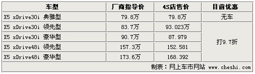 據(jù)4S店銷(xiāo)售人員介紹:目前寶馬X5除3.0升典雅型無(wú)車(chē)外,其它車(chē)型可打9.7折,最大優(yōu)惠達(dá)5.2萬(wàn)元之多。但是目前X5無(wú)現(xiàn)車(chē),預(yù)定最短需等一個(gè)半月,4.8升車(chē)型最長(zhǎng)需等半年。雖然目前X5優(yōu)惠幅度較之前有所縮水,但目前無(wú)現(xiàn)車(chē)的狀態(tài)能有小幅優(yōu)惠也算是一個(gè)小的驚喜。