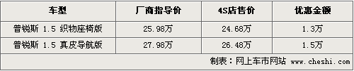 豐田普銳斯是豐田公司開發(fā)的一款混合動(dòng)力車,是較為成熟的環(huán)保車型,自進(jìn)入國(guó)內(nèi)市場(chǎng)后一直受到消費(fèi)者的歡迎。普銳斯獨(dú)特的環(huán)?萍紴楹髞(lái)的混合動(dòng)力車型提供了借鑒。目前筆者了解到,普銳斯的售價(jià)出現(xiàn)了一定幅度的松動(dòng),最高可優(yōu)惠現(xiàn)金1.5萬(wàn)元,具體車型以及價(jià)格如下列表: