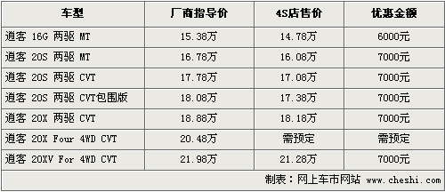 逍客是在國內(nèi)上市的第一款真正意義上的跨界車,它同時也是日產(chǎn)歐洲設(shè)計中心成立之后開發(fā)的第一款新車,既擁有SUV的時尚外觀和越野性,又有轎車的舒適性和省油優(yōu)勢。根據(jù)網(wǎng)上車市價格監(jiān)測系統(tǒng)顯示,目前逍客全系最高優(yōu)惠7000元,具體車型以及價格如下: