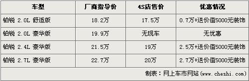 據(jù)北京克萊斯勒4s店銷售人員介紹,克萊斯勒鉑銳已經(jīng)停止進(jìn)口,除了2.0L 豪華版已沒有庫(kù)存車外,經(jīng)銷店內(nèi)還剩部分其他車型庫(kù)存車。經(jīng)7000元優(yōu)惠后,2.0L舒適版的售價(jià)從18.2萬元下降到了17.5萬元。2.4L豪華版經(jīng)2.5萬元優(yōu)惠后,售價(jià)降到了19萬元。全系最高配的2.7L豪華版經(jīng)2.7萬元優(yōu)惠后,售價(jià)下降到了20萬元。購(gòu)買鉑銳的消費(fèi)者在得到現(xiàn)金優(yōu)惠的同時(shí),還可以得到價(jià)值5000元的內(nèi)部裝飾。