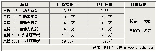 據(jù)4S店銷售人員介紹:目前速騰全系優(yōu)惠1.3萬元,較之前優(yōu)惠幅度有所增加,如在店內(nèi)做一條龍服務(wù)還可獲贈價值1000元的裝飾,裝飾主要包括腳墊、座套等。由于2.0升車型停產(chǎn),所以目前只有1.6升和1.8TSI車型。1.6升車型更注重經(jīng)濟型,而1.8TSI更加注重動力表現(xiàn)。