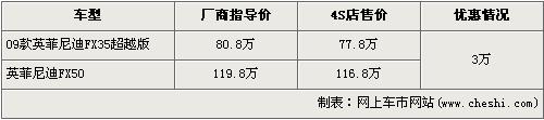 在今年,英菲尼迪FX系列上市了兩款車型,一個是以新成員身份加入的FX50,售價為119.5萬元。另一個是FX35的改款車型-09款FX35,售價為80.8萬元。隨著兩款新車的上市,老款的FX35和FX45都已停止了進口。近日據(jù)網(wǎng)上車市價格監(jiān)測系統(tǒng)顯示,英菲尼迪全系出現(xiàn)了3萬元的優(yōu)惠,具體詳情請看下表: