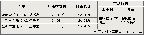 起亞進(jìn)口SUV全新索蘭托于7月29日正式上市銷售,前期推出了三款車,售價為22.98萬——26.78萬元。據(jù)網(wǎng)上車市價格監(jiān)測系統(tǒng)顯示:目前北京地區(qū)進(jìn)口起亞4S店內(nèi)無現(xiàn)車銷售,急于提現(xiàn)車的消費(fèi)者在店內(nèi)購買1.2萬元的裝飾后,即可在本周提到愛車,而預(yù)訂則需要等待一個月左右。