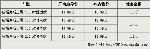 福克斯憑借出色的外觀設(shè)計(jì)及極佳的操控性贏得了市場(chǎng)的認(rèn)可,在銷量方面一直保持迅猛的勢(shì)頭。尤其新款?怂沟纳鲜,一改內(nèi)飾略顯粗糙的詬病,使得福克斯更趨于完美。?怂共捎昧宋譅栁諷40底盤(pán),將操控進(jìn)行到底,這一優(yōu)勢(shì)博得全世界的掌聲,名副其實(shí)成為了這個(gè)級(jí)別的標(biāo)桿車型。據(jù)網(wǎng)上車市價(jià)格系統(tǒng)檢測(cè)顯示,目前三廂?怂谷祪(yōu)惠1.5萬(wàn)元,具體車型價(jià)格請(qǐng)看下表: