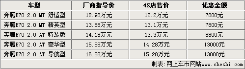據(jù)一汽奔騰汽車4S店銷售人員介紹,目前09款奔騰B70現(xiàn)車顏色不全,主要以銀色車型為主,目前手動(dòng)擋車型只能優(yōu)惠7800元;上市不久的自動(dòng)特裝版能夠優(yōu)惠8800元;而另外兩款自動(dòng)擋車型現(xiàn)在能夠優(yōu)惠13000元,如果到店還能有更多的優(yōu)惠政策。2010款奔騰將于九月中下旬推出,目前能夠接受預(yù)訂,訂金為5000元。