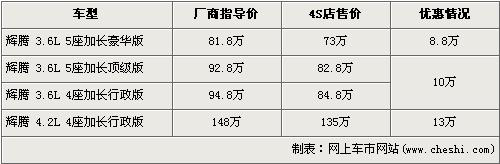 據(jù)北京進(jìn)口大眾經(jīng)銷(xiāo)店銷(xiāo)售人員介紹,目前輝騰3.6L 5座加長(zhǎng)豪華版有8.8萬(wàn)元的現(xiàn)金優(yōu)惠,經(jīng)優(yōu)惠后3.6L 5座加長(zhǎng)豪華版的售價(jià)降到了73萬(wàn)元,跌破了75萬(wàn)元。排量稍大的4.2L 4座加長(zhǎng)行政版有13萬(wàn)元的優(yōu)惠,經(jīng)優(yōu)惠后售價(jià)從148萬(wàn)元下降到了135萬(wàn)元。銷(xiāo)售人員還介紹,4.2L輝騰沒(méi)有現(xiàn)車(chē),欲購(gòu)買(mǎi)的消費(fèi)者需交訂金10萬(wàn)元預(yù)訂。
