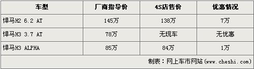 據北京悍馬經銷店銷售人員介紹,目前市場上在售的悍馬分為H2 6.2L和H3 3.7L以及H3 5.3L ALPHA 三款車型。近期購買悍馬H2 6.2L車型的消費者可以得到7萬元的優(yōu)惠,經優(yōu)惠后售價降到了138萬元。H3 3.7L店內沒有現(xiàn)車,所以沒有任何優(yōu)惠。H3 ALPHA經1萬元優(yōu)惠后,售價從85萬元下降到了84萬元。
