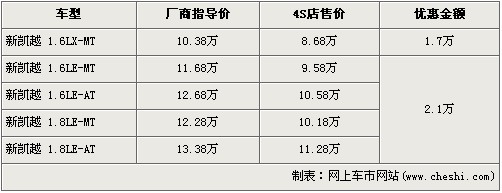 據(jù)4S店銷(xiāo)售人員介紹,新凱越分為1.6L與1.8L兩種排量車(chē)型,目前新凱越除了入門(mén)級(jí)的1.6LX-MT版優(yōu)惠1.7萬(wàn)外,其他車(chē)型均優(yōu)惠2.1萬(wàn)元。經(jīng)優(yōu)惠后,全系的最低價(jià)格降到了8.68萬(wàn)元。銷(xiāo)售人員還介紹,新凱越店內(nèi)現(xiàn)車(chē)比較充足,消費(fèi)者挑選的空間較大。