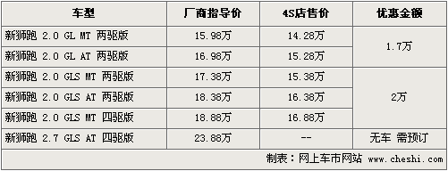東風(fēng)悅達(dá)起亞獅跑和北京現(xiàn)代途勝屬于同平臺(tái)車型,但相比途勝,獅跑外觀更有活力,F(xiàn)售的09款獅跑,時(shí)尚的外觀和改款后配置的重新升級(jí),使獅跑在同級(jí)別中的性價(jià)比進(jìn)一步提升。根據(jù)網(wǎng)上車市價(jià)格監(jiān)測(cè)系統(tǒng)顯示,目前獅跑最高優(yōu)惠現(xiàn)金2萬元,具體行情如下: