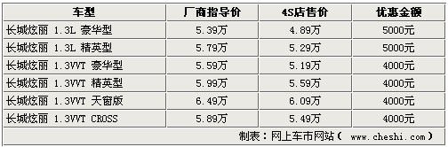 本次長(zhǎng)城炫麗首先由廠家開(kāi)始優(yōu)惠,全系車型中1.3L兩款車型官降4000元,其他車型均降3000元。而經(jīng)銷商處則可在廠家官降的基礎(chǔ)上再給出千元的優(yōu)惠。