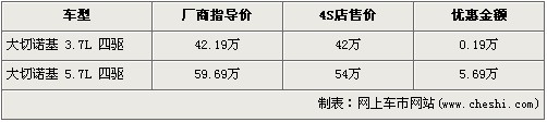據(jù)經(jīng)銷(xiāo)商銷(xiāo)售人員介紹,大切諾基3.7L車(chē)型的優(yōu)惠金額僅為1900元,而高排量的5.7L車(chē)型優(yōu)惠金額達(dá)到了5.69萬(wàn)元,達(dá)到了全系的最高。在售的Jeep-大切諾基共分為3.7L四驅(qū)和5.7L四驅(qū)兩個(gè)車(chē)型。3.7L四驅(qū)型經(jīng)1900元優(yōu)惠后,售價(jià)降為了42萬(wàn)元。而排量稍大的5.7L四驅(qū)型經(jīng)5.69萬(wàn)元優(yōu)惠后,售價(jià)降為了54萬(wàn)元。