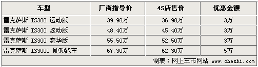 據(jù)4S店銷售人員介紹,目前雷克薩斯IS300供應(yīng)的車型均為2010款,新款車型比老款增加了諸多配置,性價比更高。同時現(xiàn)車方面,入門級和炫動版車型的現(xiàn)金優(yōu)惠為3萬元,豪華版暫時沒有現(xiàn)車,需要預(yù)訂。硬頂敞篷跑車IS300C的優(yōu)惠幅度則達(dá)到了5萬元。