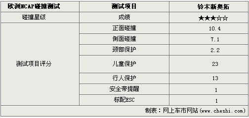 從歐洲NCAP安全碰撞測試成績可以看出,在正面碰撞測試中對正副駕駛員保護(hù)都很一般,因此總成績僅獲得三星的評價,這在NACP的測試中是不多見的。在正面碰撞中,新奧拓僅得到了10.4分的成績。在側(cè)面碰撞中,新奧拓也只得到了7.1分。而新增的頸部保護(hù)測試方面,也只有的2.2分。在兒童保護(hù)中,由于不能關(guān)閉副氣囊無法在前座安裝兒童安全座椅,同時后排座椅也有顯著的兒童座椅安裝標(biāo)識。由于新奧拓在歐洲市場將標(biāo)配安全帶未系提醒和ESC電子穩(wěn)定程序,因此獲得了2分的加分。