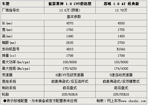 這次選擇的兩個車款是價格比較接近的,僅差1800元且都是自動擋,首先在基本參數(shù)上,藍瑟翼神要比思域車身略長一些,但在軸距上思域要略有優(yōu)勢,這在內(nèi)部空間上將有所體現(xiàn)。在動力上,藍瑟翼神與思域的1.8L發(fā)動機在參數(shù)上比較接近,但在變速器上藍瑟翼神裝備的是6速CVT變速器更先進一些。在懸掛系統(tǒng)方面,藍瑟翼神的后五連桿式也要比思域的雙橫臂式乘坐舒適性更好一些,但維護成本要高一些。