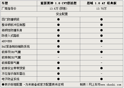 在安全配置上,藍瑟翼神配置了前排雙氣囊、膝部氣囊、四門防撞梁等被動安全裝備,而在主動安全配置上,ABS、EBD、BAS等都為標配,而在看思域,要比藍瑟翼神遜色一些,少了BAS、膝部氣囊、倒車雷達等安全配置。