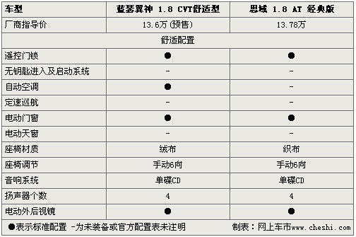 在舒適配置上,藍瑟翼神與思域都配置了遙控門鎖、單碟CD、電動門窗、電調(diào)后視鏡等配置,而在此基礎(chǔ)上藍瑟翼神還配置自動空調(diào),而思域為手動控制空調(diào),駕駛席座椅兩車都為絨布6向調(diào)節(jié)設(shè)置。