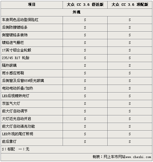 從外觀上看,大眾CC 3.6舒適版和頂配版沒(méi)有任何區(qū)別。車(chē)身同色運(yùn)動(dòng)型保險(xiǎn)杠、車(chē)身鍍鉻裝飾條、235/45 R17大尺寸輪胎、外后視鏡集成LED轉(zhuǎn)向燈以及雙氙氣大燈帶自動(dòng)清洗裝置均出現(xiàn)在兩款車(chē)型上。