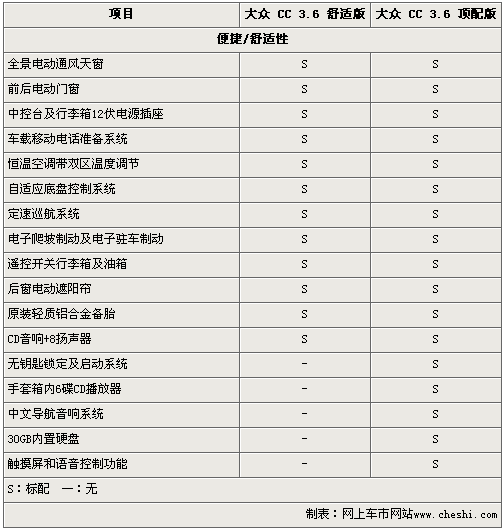 大眾CC轎跑車(chē)?yán)^去年底廣州車(chē)展在國(guó)內(nèi)首次亮相后,其全系兩款車(chē)型已于日前正式上市,售價(jià)為50.5萬(wàn)元和53.68萬(wàn)元。那么同樣搭載3.6升FSI引擎的大眾CC 舒適版和頂配版車(chē)型為什么差價(jià)高達(dá)3.18萬(wàn)呢?通過(guò)對(duì)以下大眾CC轎跑車(chē)配置差異的解析,您也許會(huì)找到正確答案。