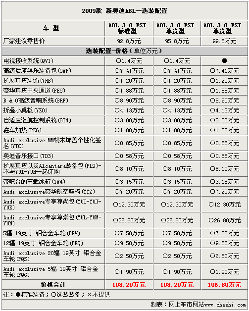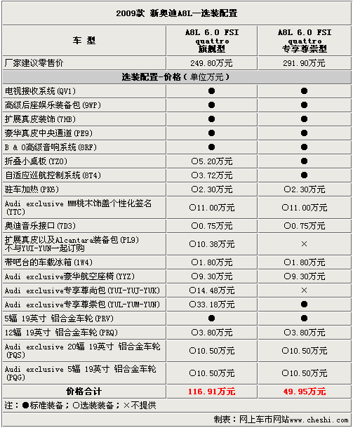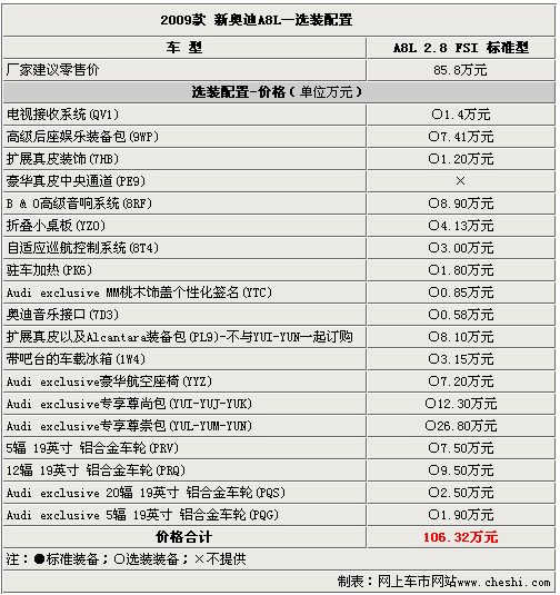 以上的選裝配置需要在預(yù)訂車輛前選擇好,經(jīng)銷商會(huì)根據(jù)客戶的訂單向廠家發(fā)送配置代碼。09款?yuàn)W迪A8L的選裝配置十分豐富,完全可以滿足對(duì)配置有需求消費(fèi)者的“苛刻”要求。當(dāng)然,這些配置也需要不菲的金錢(qián)才可以擁有,究竟哪些配置適合有品位懂得享受的您呢?