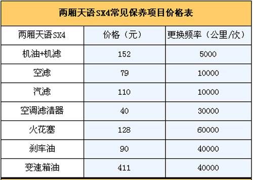 4.保養(yǎng)費:我們向長安鈴木4S店售后服務(wù)人員咨詢過,廠家規(guī)定天語SX4的首保時間為兩個月或者1500~2500公里(以先到為準(zhǔn)),正常保養(yǎng)周期為5000公里,假設(shè)一年跑2萬公里,一年則需要做保養(yǎng)4次。第一次常規(guī)保養(yǎng)(只更換機油機濾,首保免費)費用為152元;第二次(更換機油機濾+空氣濾芯+汽油濾芯)為341元;第三次常規(guī)保養(yǎng)(更換機油機濾)152元;第四次(更換機油機濾+空氣濾芯+汽油濾芯+變速箱油)為411元,此外空調(diào)濾芯3萬公里更換,剎車油4萬公里更換,那么2年/4萬公里的保養(yǎng)費用為2242元,平均一年兩萬公里需花費為1121元左右。
