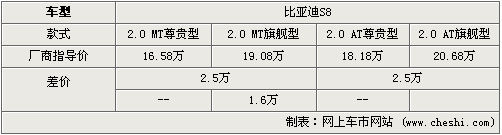 比亞迪S8是國(guó)內(nèi)首款具有硬頂敞篷技術(shù)的轎跑車,是比亞迪又一款高端化戰(zhàn)略產(chǎn)品。S8凝聚了比亞迪多年成功的轎車研發(fā)經(jīng)驗(yàn),融合了國(guó)際汽車制造領(lǐng)域最尖端的汽車科技,全面展現(xiàn)了比亞迪汽車強(qiáng)大的技術(shù)實(shí)力。其中手動(dòng)擋或自動(dòng)擋的尊貴型與旗艦型差價(jià)為2.5萬(wàn),而手動(dòng)擋與自動(dòng)擋車型之間的差價(jià)為1.6萬(wàn)元。