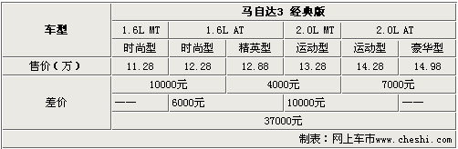 長安馬自達(dá)馬3經(jīng)典版1.6L排量車型共有3款車型,由于外觀、內(nèi)飾和舒適豪華配置的差異,這3款車的最高差價為6000元。而長安馬自達(dá)馬3經(jīng)典版1.6L手動時尚型和2.0L自動豪華型除配置差異外,動力性能也存在一定的差距,所以差價高達(dá)3.7萬元。