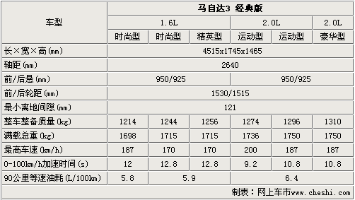馬3經(jīng)典版全系車型的車身尺寸達(dá)到了4515 X 1745 X 1465mm;雖然這款車采用了更加運動的前臉,但是車身尺寸較老款車型并沒有變化,而且這款車的離地間隙為121mm,比較適應(yīng)國內(nèi)的復(fù)雜路況。由于排量的不同,這六款車的加速時間也有所區(qū)別,其中1.6L自動擋車型的加速時間為12.8秒,2.0L手擋車型的加速時間為9.2秒。
