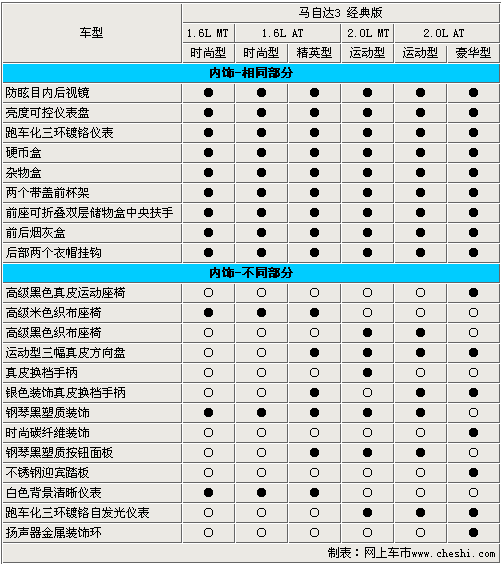 在內(nèi)飾配置方面,新馬3經(jīng)典版的6款車型的配置還是比較齊全的。四門電動車窗、室內(nèi)照明燈、防炫目后視鏡、方向盤高度可調(diào)、帶過濾清新空調(diào)等配置都可以在這幾款車中找到。不過,2.0L高配車型采用了跑車式鍍鉻儀表盤、真皮座椅、迎賓踏板等配置,而2.0L手動版車型還采用了黑色內(nèi)飾、真皮換擋手柄等配置。