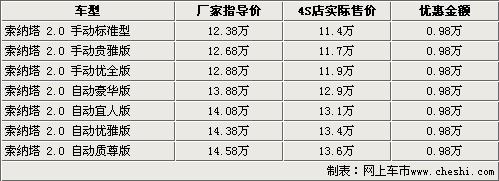 索納塔作為北京現(xiàn)代銷售的第一款車型,在中國地區(qū)銷售了已經(jīng)快7年了。隨著新車型的增加,索納塔已經(jīng)漸漸的失去了市場競爭力了。在4月的上海國際車展上,北京現(xiàn)代展出了自主研發(fā)車型新索納塔BT01,一經(jīng)亮相就立刻受到了中國消費(fèi)者的關(guān)注。近日我們從北京現(xiàn)代內(nèi)部人士處獲悉到,主研發(fā)車型新索納塔BT01將于7月份正式推出。與此同時,根據(jù)網(wǎng)上車市價格監(jiān)測系統(tǒng)顯示,目前銷售的索納塔全系均出現(xiàn)了大幅優(yōu)惠,2.0標(biāo)準(zhǔn)版車型的售價僅為11.4萬。具體車型售價見下表: