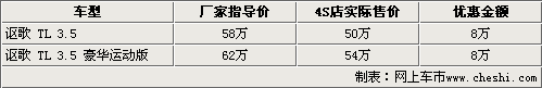 09新款的謳歌TL在去年12月份正式進入國內(nèi)市場銷售,相比之前老款車型,09款在外觀、性能、排量上均有不同程度的提升。近日謳歌為了可以更好的適應(yīng)中國市場的需求推出了TL豪華運動版車型,售價62萬元。與此同時根據(jù)網(wǎng)上車市價格監(jiān)測系統(tǒng)顯示,目前購買TL均可以得到8萬元的現(xiàn)金優(yōu)惠,其中也包括剛剛推出的豪華運動版。具體車型售價見下表: