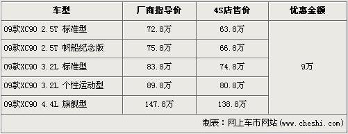 沃爾沃XC90是沃爾沃XC系列車型中的頂級產(chǎn)品,是沃爾沃汽車公司在全球推出的首款全時四輪驅(qū)動的SUV車型,同時也是沃爾沃首款進入中國市場的SUV車型。近日據(jù)網(wǎng)上車市價格數(shù)據(jù)監(jiān)測顯示,09款沃爾沃XC90全系現(xiàn)金優(yōu)惠9萬元,具體詳情請看下表: