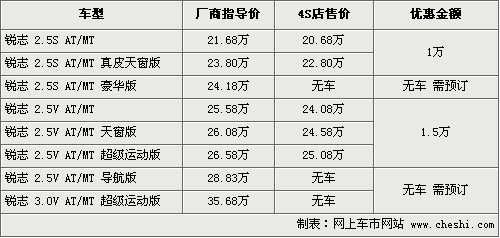 銳志的原車型是在日本廣受好評的“MARK-X”系列,國產(chǎn)后的銳志同MARK X一樣配備有2.5L和3.0L兩種排量的發(fā)動機,但取消了四驅(qū)車型,全部為前置后驅(qū),同時超長的軸距設(shè)計讓乘員的空間也有了非常理想的狀態(tài)。同時也是頗受改裝車迷喜愛的一款車型,目前銳志在車款的價格上有一定幅度的優(yōu)惠,最高可優(yōu)惠1.5萬元,具體車型和價格如下: