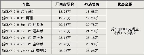 據(jù)4S店銷售人員介紹,目前購(gòu)買本田CR-V仍需要加價(jià)提車,需要加現(xiàn)金8000元或者加1.5萬元的全車裝飾,裝飾包括了腳墊、尾翼、行李架、踏板等。消費(fèi)者可根據(jù)需求選購(gòu),但是必須達(dá)到1.5萬元的消費(fèi)金額。目前2.0和2.4自動(dòng)檔有黑色、銀色現(xiàn)車供應(yīng),其他特殊顏色還需要預(yù)定。