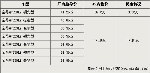 據(jù)北京寶馬經(jīng)銷店的銷售人員介紹,目前購買寶馬新520Li領(lǐng)先型可以得到3.66萬元的優(yōu)惠,經(jīng)優(yōu)惠后新520Li領(lǐng)先型的售價從41.26萬元降到了37.6萬元。銷售人員還介紹,目前店內(nèi)除了520Li領(lǐng)先型有現(xiàn)車外,其它車型均無現(xiàn)車,欲購買的消費(fèi)者需交定金2萬元,約等1個月后可提車。