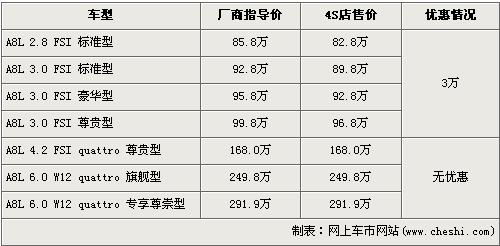 據(jù)北京奧迪經(jīng)銷店銷售人員介紹,2.8L和近期剛上市的3.0L店內(nèi)有現(xiàn)車,并且購(gòu)買的消費(fèi)者可以得到3萬(wàn)元的優(yōu)惠。經(jīng)優(yōu)惠后,全系最低配的2.8 FSI標(biāo)準(zhǔn)版售價(jià)從85.8萬(wàn)元下降到了82.8萬(wàn)元。銷售人員還介紹,4.2L以及6.0L Quattro版車型均無(wú)現(xiàn)車,欲購(gòu)買著需交10萬(wàn)訂金,等半年左右才可提車。