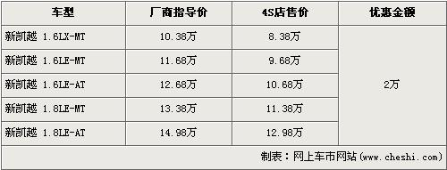 據(jù)4S店銷售人員介紹,新凱越分為1.6L與1.8L兩種排量車型,目前新凱越全系優(yōu)惠2萬元,較上個月的優(yōu)惠降幅有所下降。經(jīng)優(yōu)惠后,全系最低配的1.6LX-MT車型售價下降到了8.38萬元。經(jīng)優(yōu)惠后,1.8L手動和自動兩款車型售價也下降到了11.38萬元和12.98萬元。銷售人員還介紹,目前店內(nèi)現(xiàn)車齊全,是消費者挑選的較好時機。