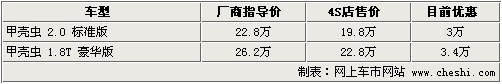 據(jù)4S店銷售人員介紹:目前甲殼蟲硬頂版本車型共有2款,2.0升與1.8T車型店內(nèi)均有現(xiàn)車,2.0升車型目前顏色較為齊全,有綠色、紅色、米色、黑色、藍(lán)色車款,最高可優(yōu)惠3萬元,1.8T車型指導(dǎo)價改為26.2萬元,優(yōu)惠后僅為22.8萬元。