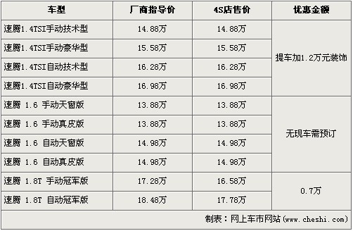 自來勢洶洶的速騰1.4TSI車型于9月份上市以后,一汽大眾旗下主打緊湊車市場的速騰車系隊伍再次得到了擴(kuò)大,同時也得同級競爭車型帶來了強(qiáng)烈的競爭。近日據(jù)網(wǎng)上車市價格系統(tǒng)檢測顯示,速騰1.4TSI提現(xiàn)車須在店內(nèi)加裝價值1.2萬元的裝飾,具體車型價格詳情請看下表: