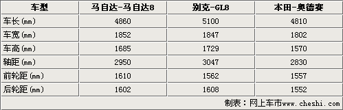 國產(chǎn)馬自達8的車身尺寸為長4860mm;寬1852mm;高1685mm,完全達到了大型MPV的身材尺寸。從上表我們可以看出馬自達8的身材處于別克GL8和本田奧德賽之間,但是馬自達8的車型是三款車最寬的,相比其它兩款車型它的橫向空間是最寬裕的。馬自達8的軸距達到了2950mm,將近3米的長度完全可以滿足多人商務用途。