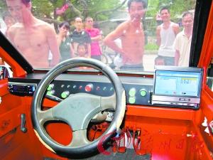 車前的大燈和轉(zhuǎn)向燈,車后的剎車燈和倒車?yán)走_(dá)和正規(guī)的小轎車幾乎沒兩樣,4個(gè)車門雖然還沒有裝玻璃,但是門和門框結(jié)合密實(shí)。車內(nèi)前面只有一個(gè)駕駛座,駕駛座左手邊是有5個(gè)擋位的擋桿,后面是一個(gè)可折疊的并排兩座位。一個(gè)從“五菱”車上淘來的方向盤控制車的轉(zhuǎn)向,方向盤后是平整的控制臺(tái),上面按了大燈、倒車?yán)走_(dá)、散熱風(fēng)扇和電子打火等不同顏色的按鈕,最讓人驚嘆的是,在操控臺(tái)兩邊還安裝了一個(gè)可自動(dòng)伸縮的DVD播放系統(tǒng)。