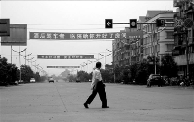 進(jìn)入夾江城區(qū),主要街道上隨處可見(jiàn)禁止酒后駕車的宣傳橫幅。其中,縣城瓷都大道與迎春南路交會(huì)處的兩條標(biāo)語(yǔ)尤為醒目,上面分別寫著“酒后駕車者醫(yī)院給你開(kāi)好了房間”“酗酒開(kāi)車是駛向死亡與墳?zāi)沟倪x擇”等警示內(nèi)容。