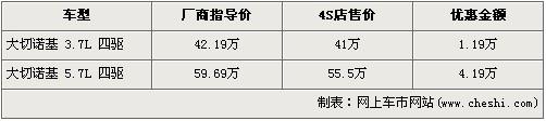 據(jù)經(jīng)銷商銷售人員介紹,目前Jeep大切諾基全系最高優(yōu)惠4.19萬元。大切諾基共分為3.7和5.7兩個排量,3.7L車型經(jīng)1.19萬元的優(yōu)惠后,售價從42.19萬元下降到了41萬元;而排量更大的5.7L車型經(jīng)4.19萬優(yōu)惠后,售價從56.69萬元下降到了55.5萬元。