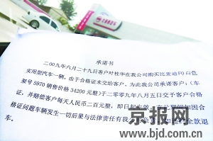 上午10時許,記者來到了位于豐臺區(qū)花鄉(xiāng)羊坊930號的金博藍汽車銷售服務公司,新車停車場里和展示廳內只有4輛新車待售,偶爾還有人在看車試車。買了車卻拿不到合格證的車主陸續(xù)來到4S店,他們手中都拿著一份“承諾書”,其中承諾8月5日交付合格證,并賠償一定金額,如果違約則全款退車。